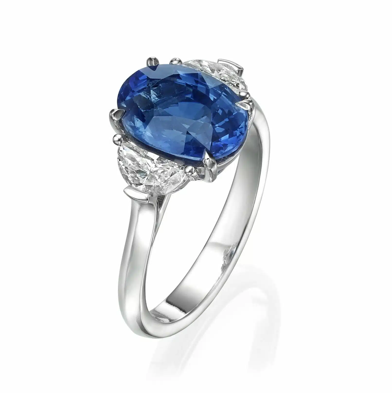 טבעת מרהיבה ויוקרתית, משובצת אבן חן ספיר טבעית, צלולה ובעלת גוון רויאל ולצידה שני יהלומים נקיים בחיתוך חצי ירח.
