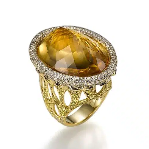 טבעת יוקרה בעיצוב מקורי ובלעדי, משובצת אבן חן סיטרין בעלת גוון כתום צהוב ויהלומים.