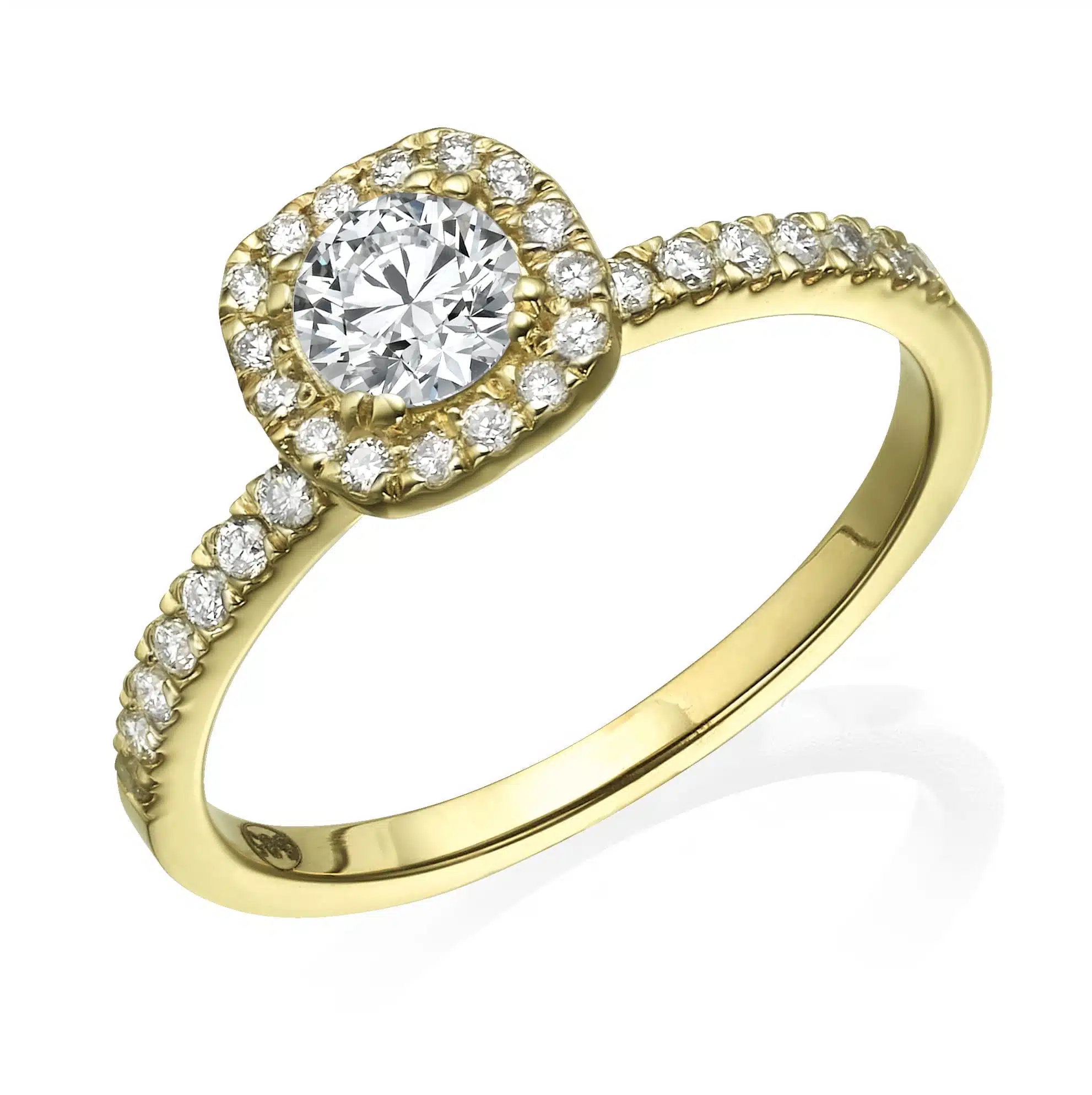 טבעת מרהיבה, משובצת יהלום מרכזי עגול וסביבו הילת יהלומים בעיצוב מרובע, דבר היוצר מראה של יהלום גדול בחיתוך “קושן”.
