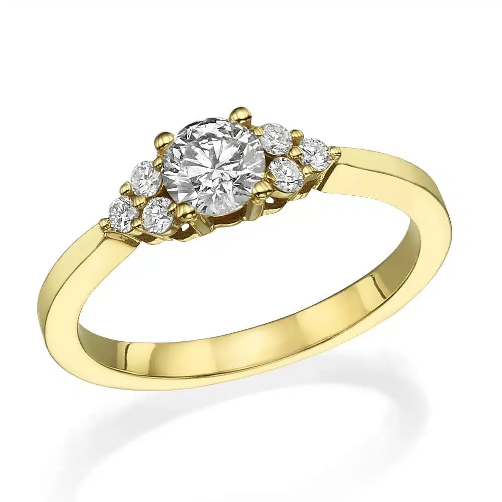 טבעת מיוחדת, משובצת יהלום מרכזי עגול ולצידו 6 יהלומים קטנים יותר היוצרים עיטור משולש.