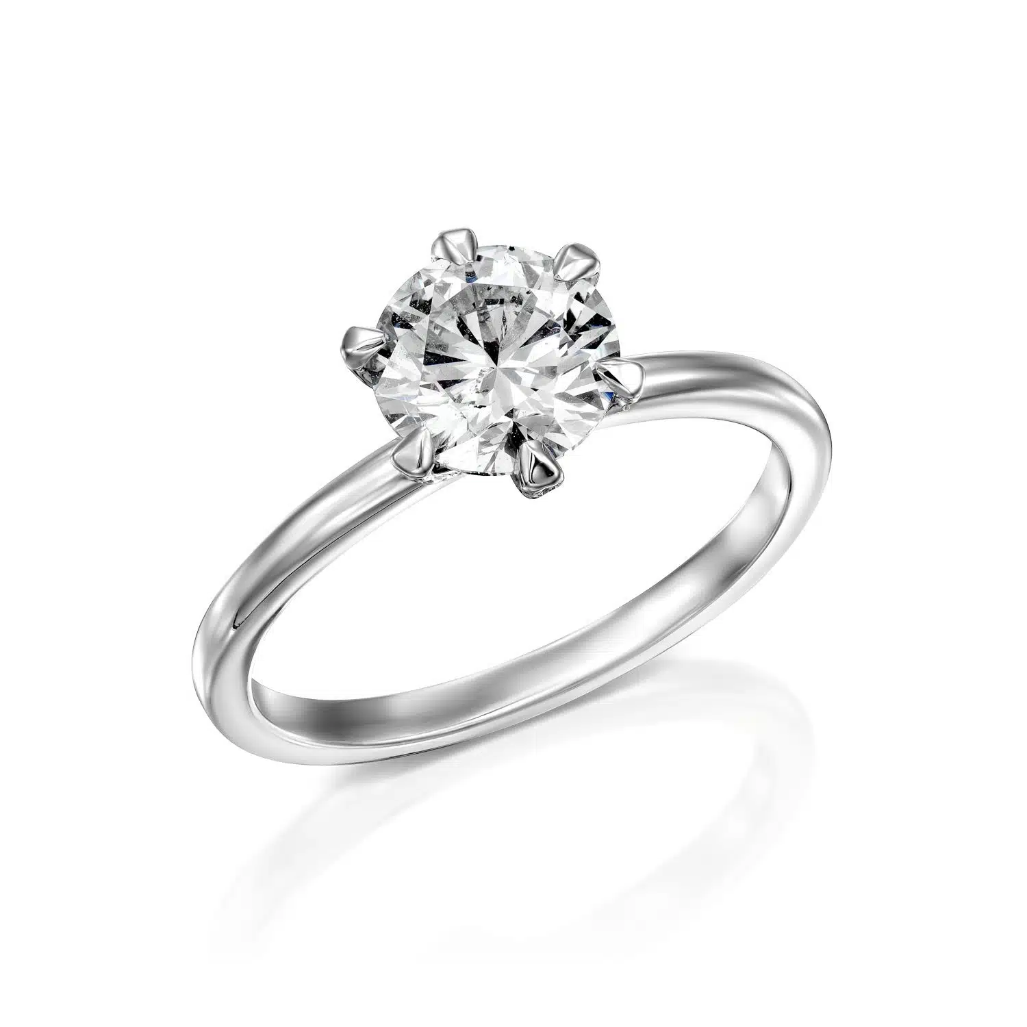 טבעת קלאסית, משובצת יהלום בחיתוך עגול  ויהלומי צד על השיניים האוחזות את היהלום המרכזי.