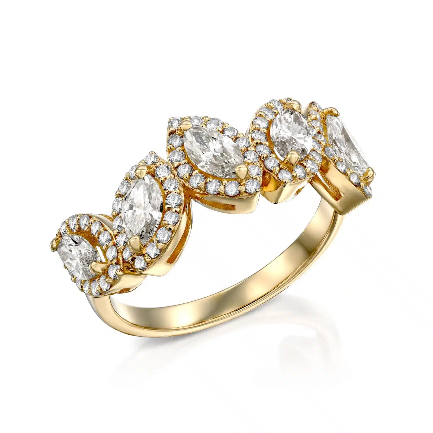 טבעת מרשימה, משובצת חמישה יהלומים בחיתוך “מרקיז”.