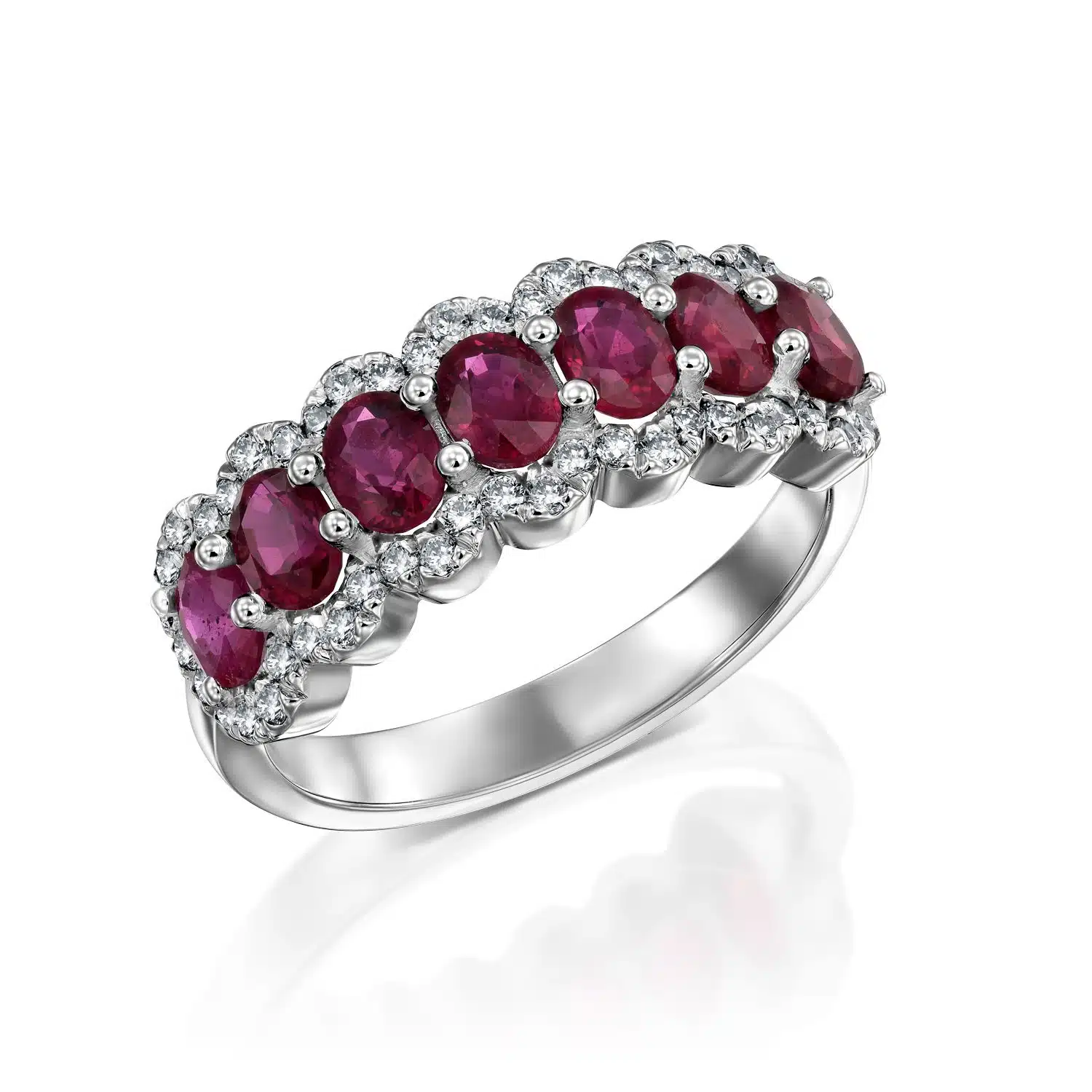 טבעת יוקרתית ומרשימה, משובצת שבעה אבני חן מסוג רוב ויהלומים מסביב.