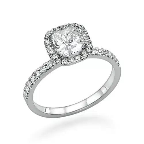 טבעת קלאסית ויוקרתית, משובצת יהלום מרכזי בחיתוך “קושן” ויהלומי צד עדינים סביבו ליצירת מראה עשיר וזוהר.