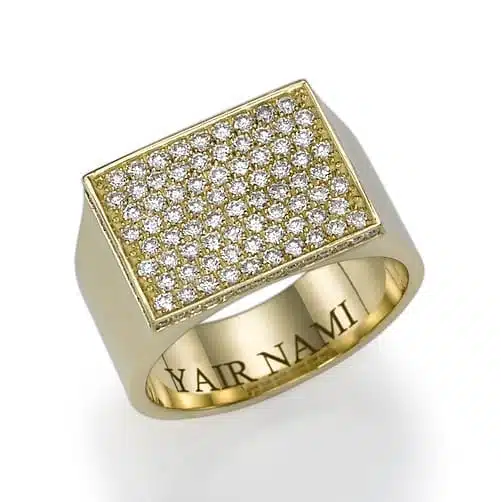 טבעת מרשימה ובולטת בשטח לגבר, בעיצוב גיאומטרי, עם יהלומים בשיבוץ “פאווה”.