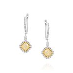 עגילים ייחודיים ויוקרתיים, משובצים יהלומים טבעיים בחיתוך קושן בצבע Fancy Yellow היוקרתי