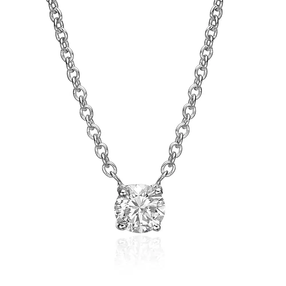 תליון סוליטר מעודן בסגנון נקי, משובץ יהלום עגול בארבע שיניים עדינות שלא נראות ממרחק.