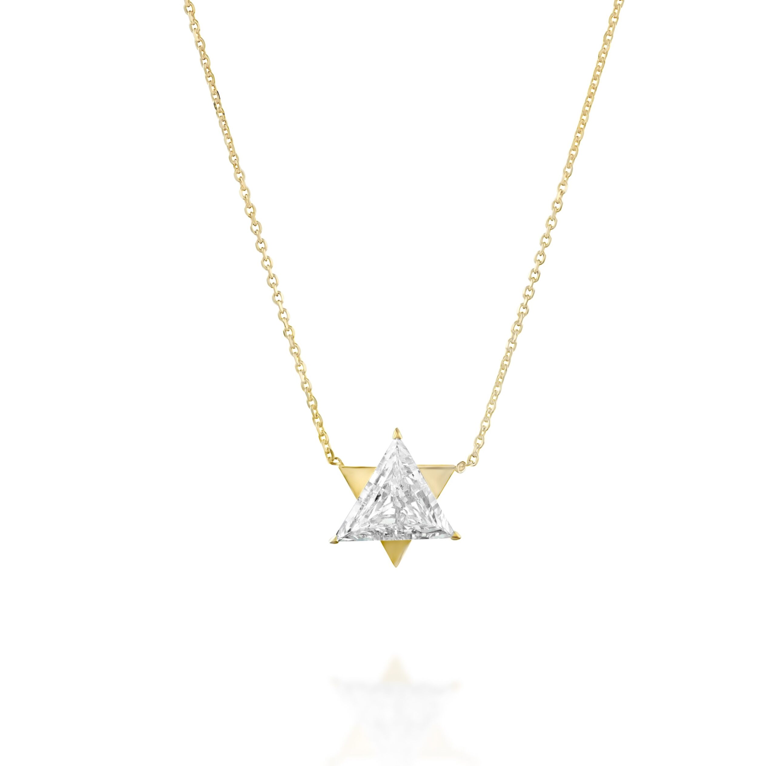 תליון מגן דוד בעיצוב ייחודי, משובץ יהלום גדול בחיתוך משולש מרהיב.