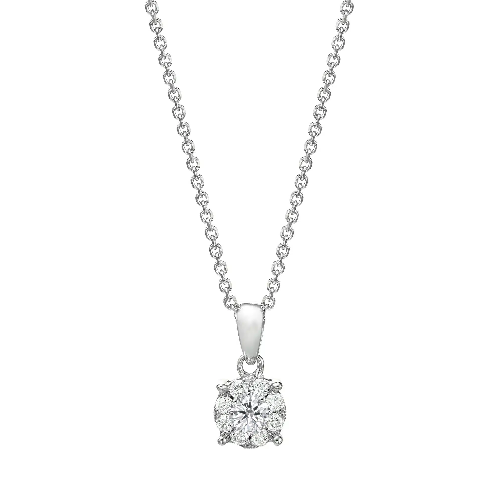תליון יהלומים בעיצוב ייחודי, משובץ יהלום מרכזי עגול וסביבו שורת יהלומי צד איכותיים היוצרים מראה של יהלום אחד גדול.