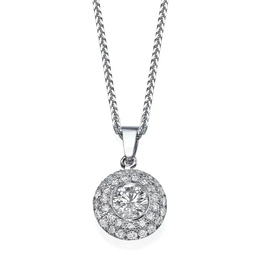 תליון קלאסי, משובץ יהלום מרכזי עגול ויהלומי צד בשיבוץ פאווה היוצרים מראה מרשים ומנצנץ.