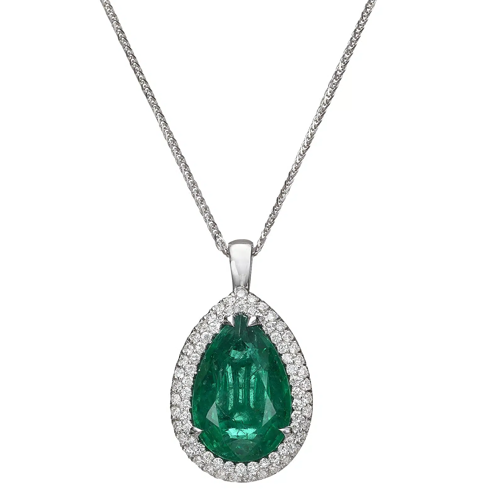 תליון מעוצב בלעדית, מותאם לאבן החן המרכזית מסוג “אמרלד” בחיתוך טיפה.